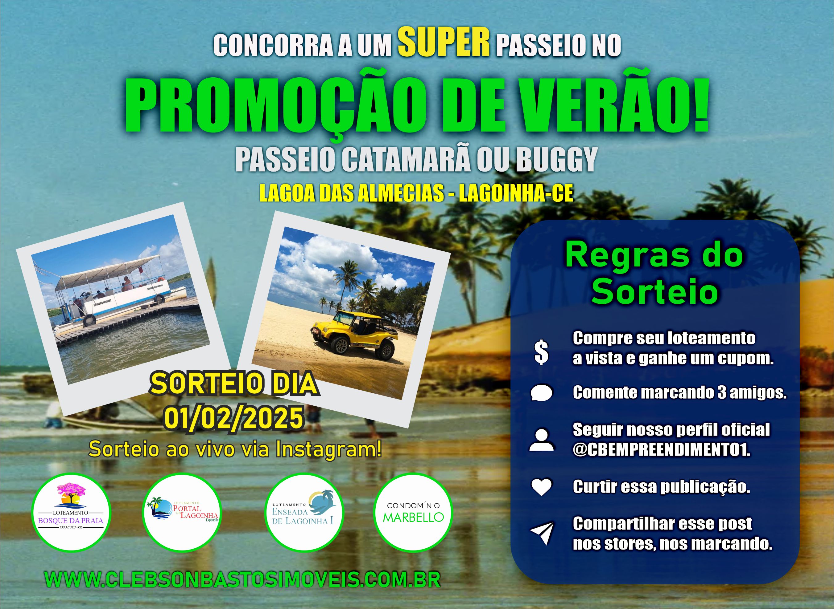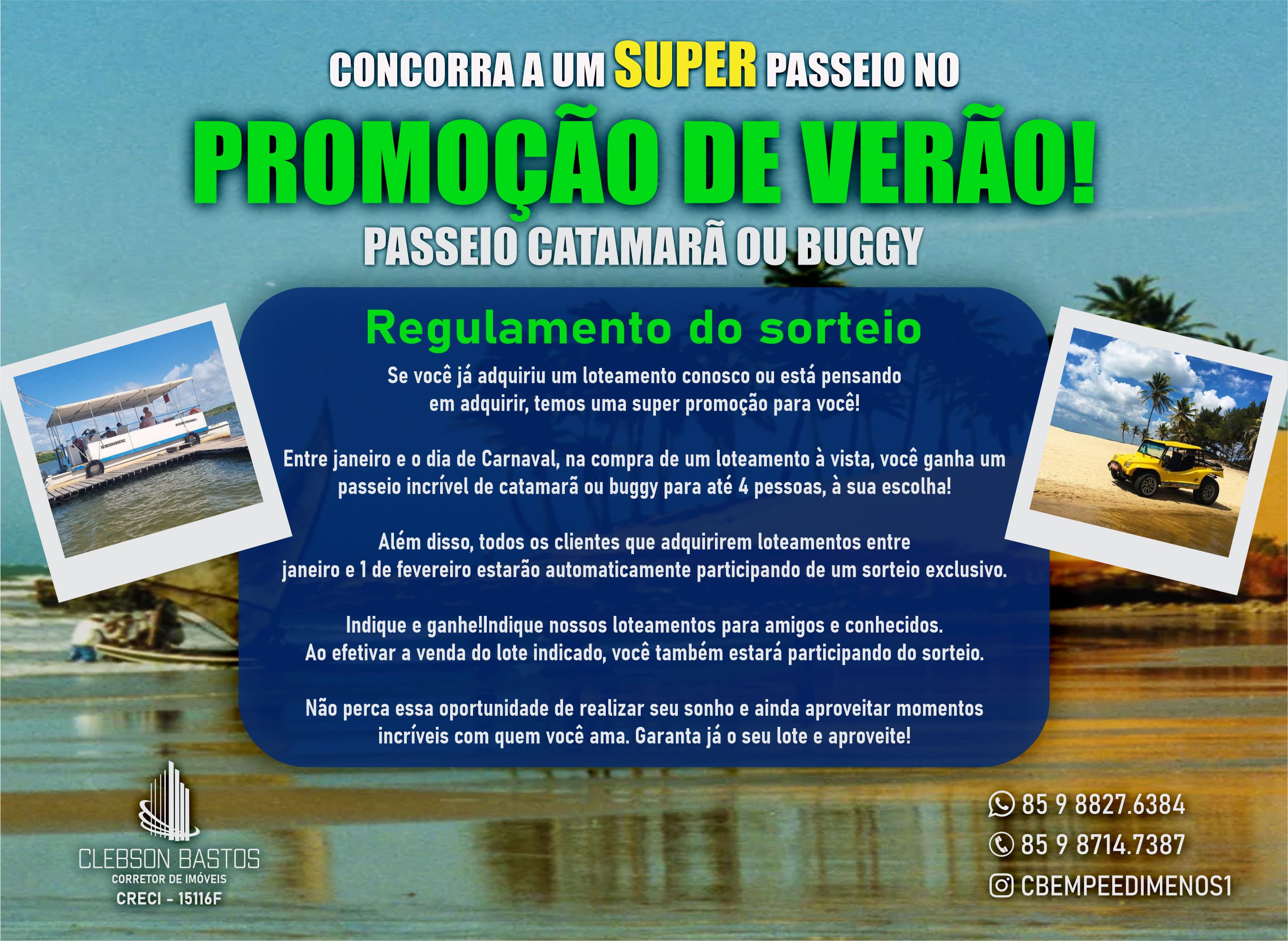 Nesse mês das ferías na compra de qual quer loteamento a vista, ganhe um cupom para participar do nosso super sorteio de um passeio de catamarã ou buggy a sua escolha.